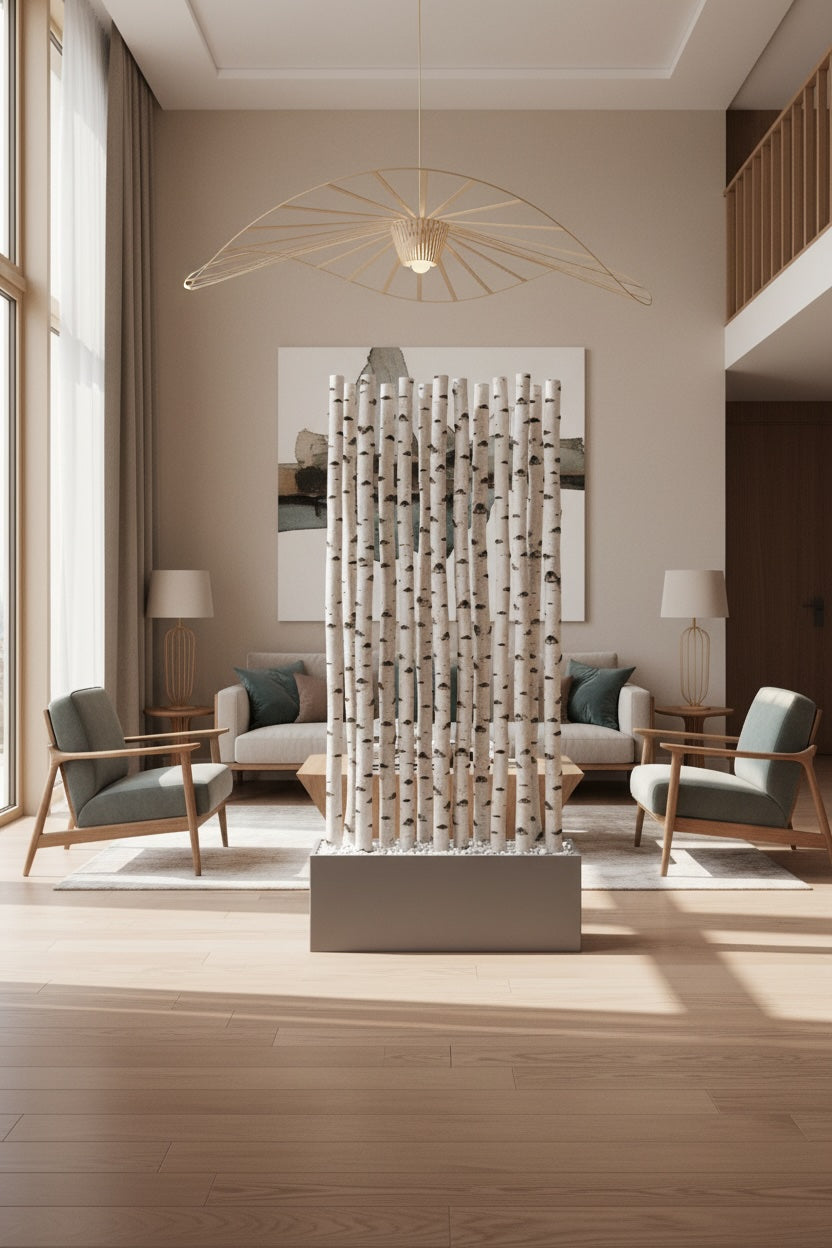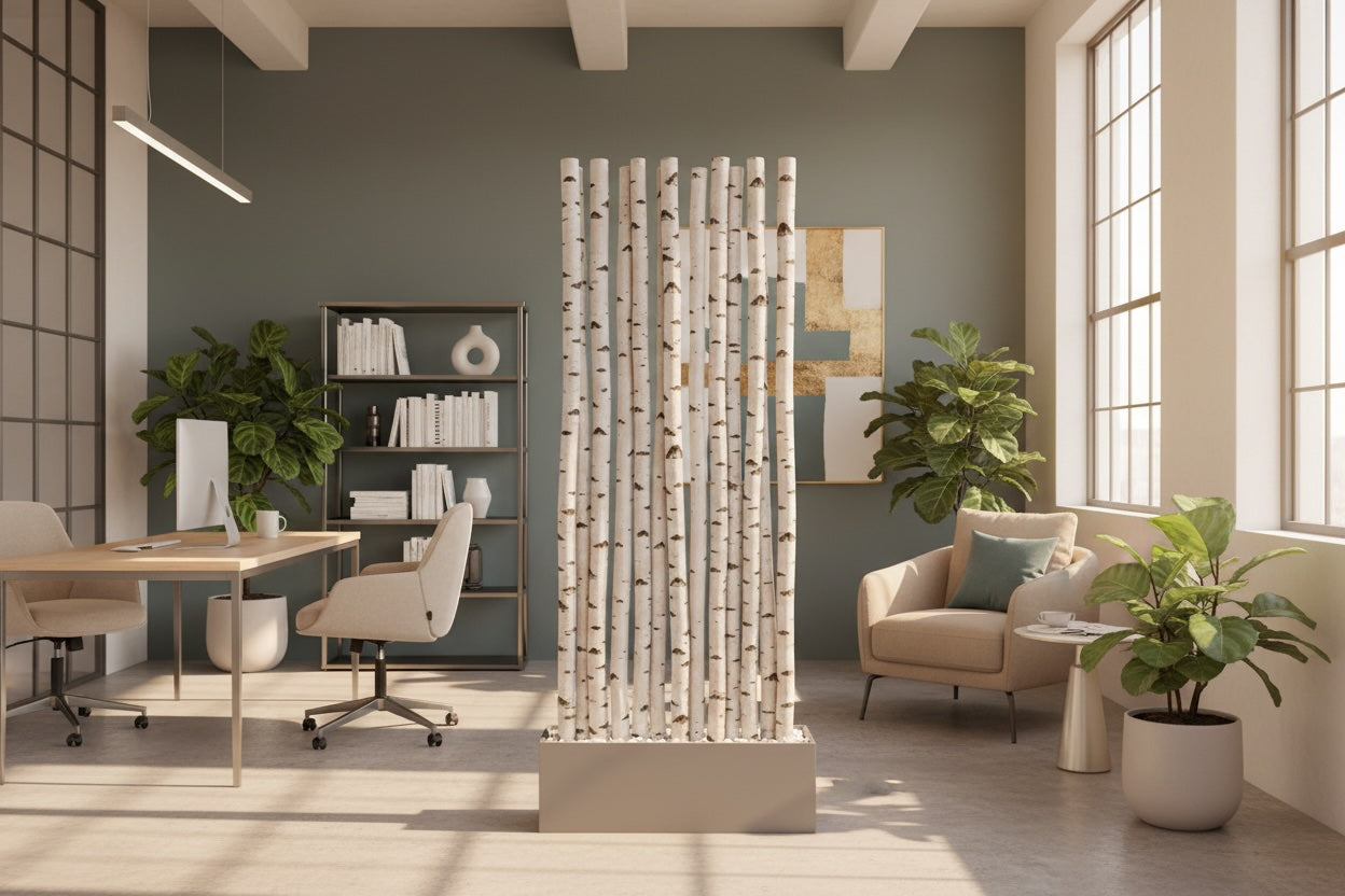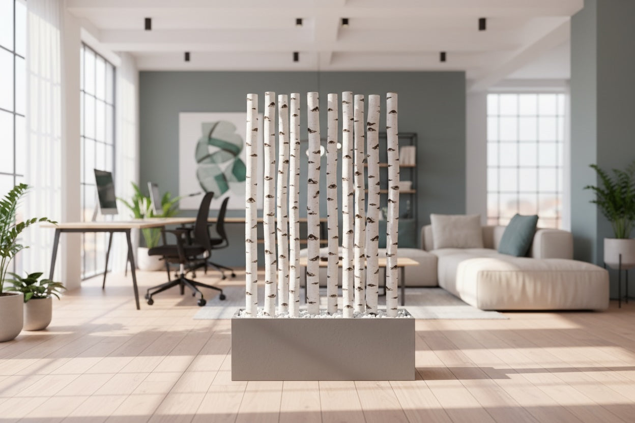 Oft werden Birkenstämme als Raumtrenner eingesetzt. Die Wahl der richtigen Anzahl kann dabei manchmal knifflig sein. Mehr dazu unter Montage.